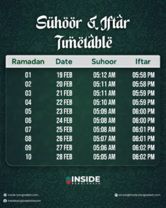 The official beginning of Ramadan 2026 will be confirmed after moon sighting by the Islamic Foundation Bangladesh. As always, Muslims across the country are encouraged to follow the officially declared Sehri and Iftar timings to ensure accurate fasting.