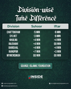 The division wise time difference for Suhoor and Iftar in Bangladesh varies slightly from Dhaka’s standard timetable, as confirmed by the Islamic Foundation. In Chattogram, Suhoor is 5 minutes earlier and Iftar is 6 minutes earlier. Sylhet observes Suhoor 3 minutes earlier and Iftar 6 minutes earlier. Khulna and Barishal are both 4 minutes later for Suhoor and Iftar, while Rajshahi is 4 minutes later for Suhoor and the same time for Iftar. Rangpur is 7 minutes later for Suhoor and 3 minutes later for Iftar. Mymensingh follows the exact Dhaka time with no difference for both Suhoor and Iftar. Muslims across the country should adjust their fasting times according to their respective division for accurate observance during Ramadan.